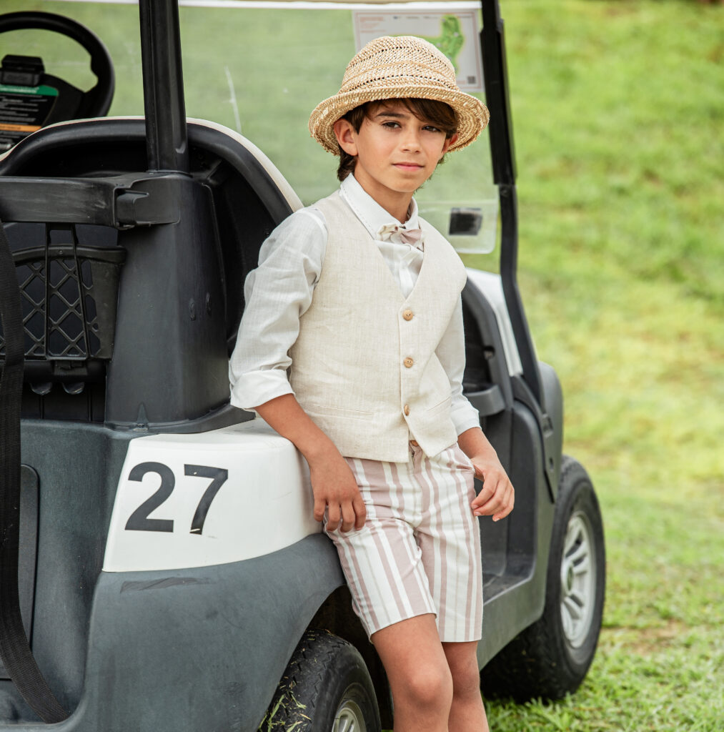 La colección Porcelana respira elegancia en sus detalles. Confeccionada en un tejido de rayas rosa empolvado con toques de lino. Imprescindible para esos momentos únicos